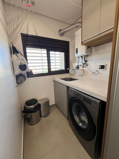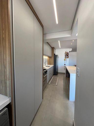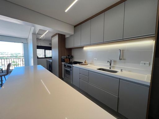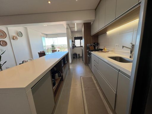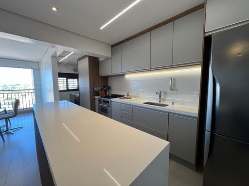 - Cozinha equipada com pia e ilha em quartzo branco.