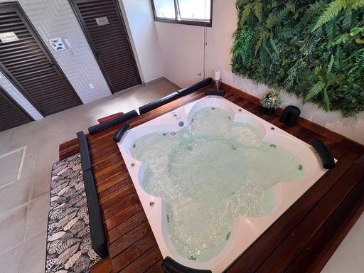 • Piscina com raia, iluminação, cascata e sol o dia todo